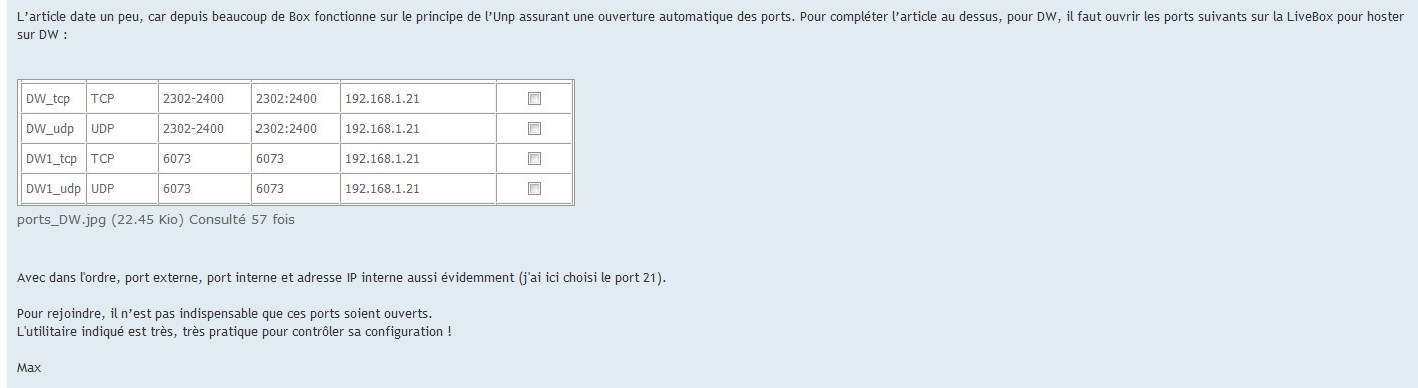 Re: Ports à ouvrir pour jouer à DW