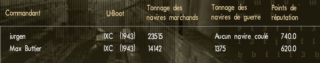 En l’absence de u936, nous avons joué une petite attaque de convoi en 1943. J’ai voulu attaquer le convoi en premier, ce que j’ai fait avec un certain succès, mais évidemment, j’ai attiré les DD qui m’ont un peu amoché ! Obligé de me planquer jusqu’à la fin de la rencontre, car plus de périscopes, jurgen m’a tranquillement remonté au score sur la fin.