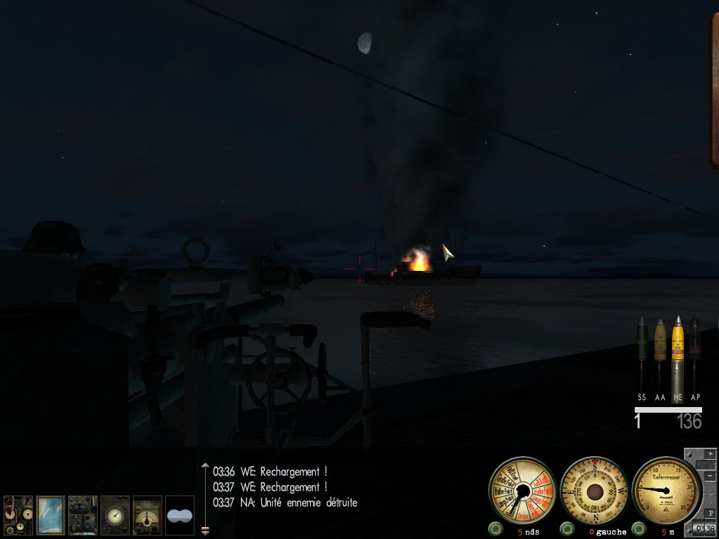 Bonne efficacité, la météo est bonne cela aide, 4 bateaux coulés avec 3 torpilles, car il est encore possible d'utiliser le canon de 105 :